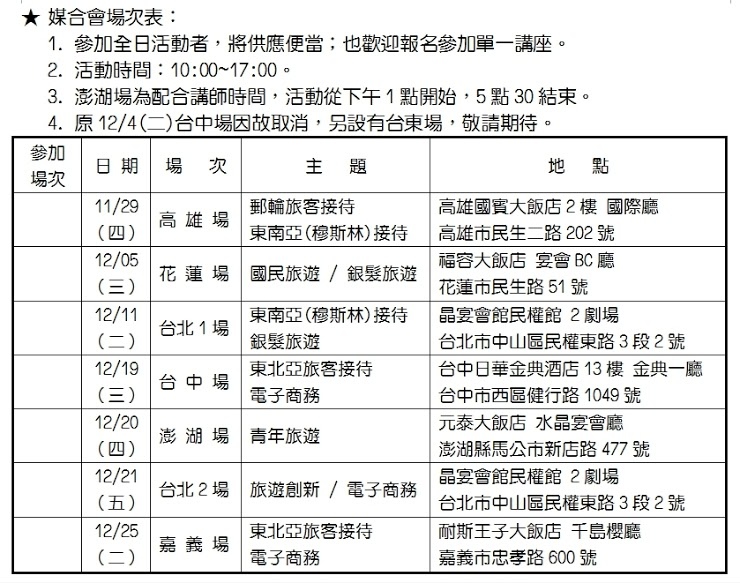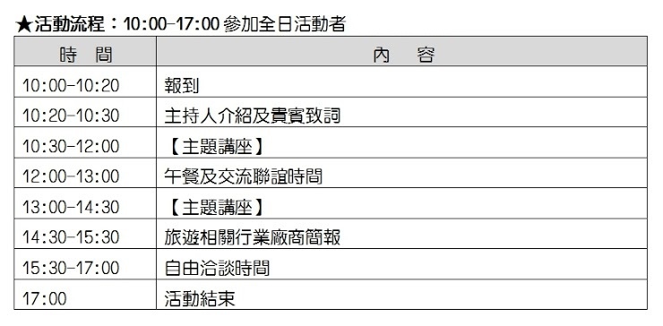 目的為協助旅遊業能夠多元發展,開拓新型態的旅遊市場。希望透過此活動,為不同產業界的廠商創造交流管道,達到業者間互助互益,並創造商機。