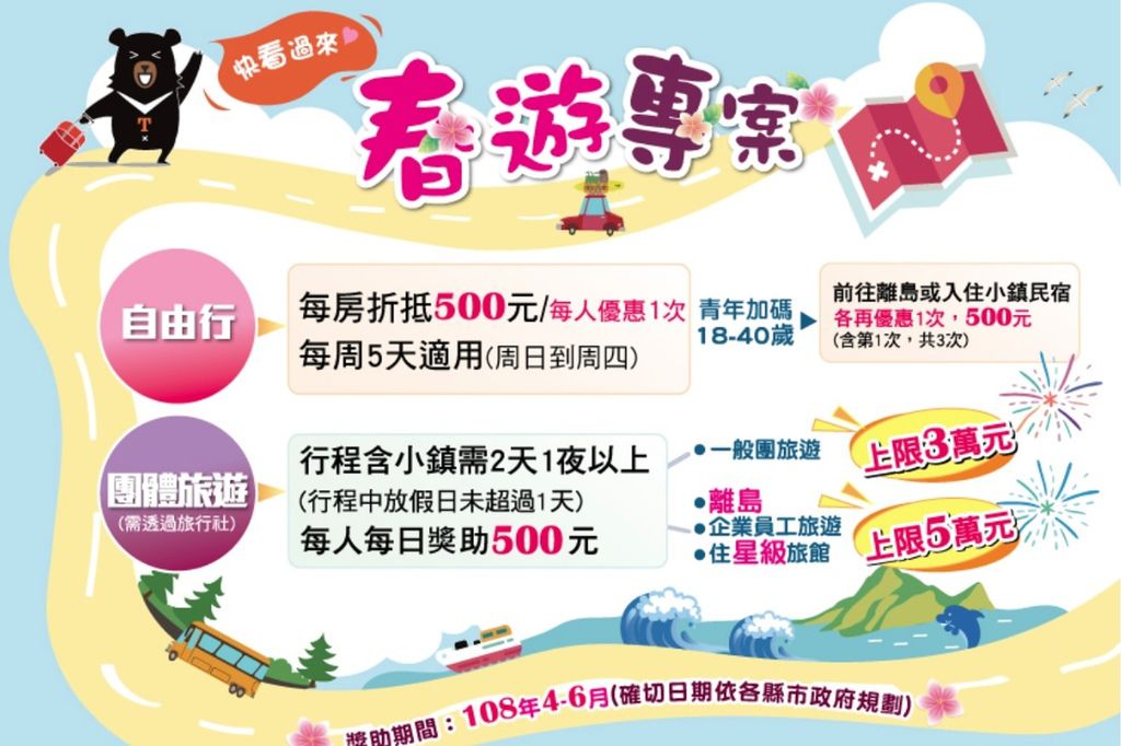 自由行旅客自108年4月1日起至108年6月30日止,週日至週四入住有參加春遊活動的新北市合法旅宿之民眾,請填寫下列表單,享有頂級旅宿抽獎資格。(登錄頁面請點)